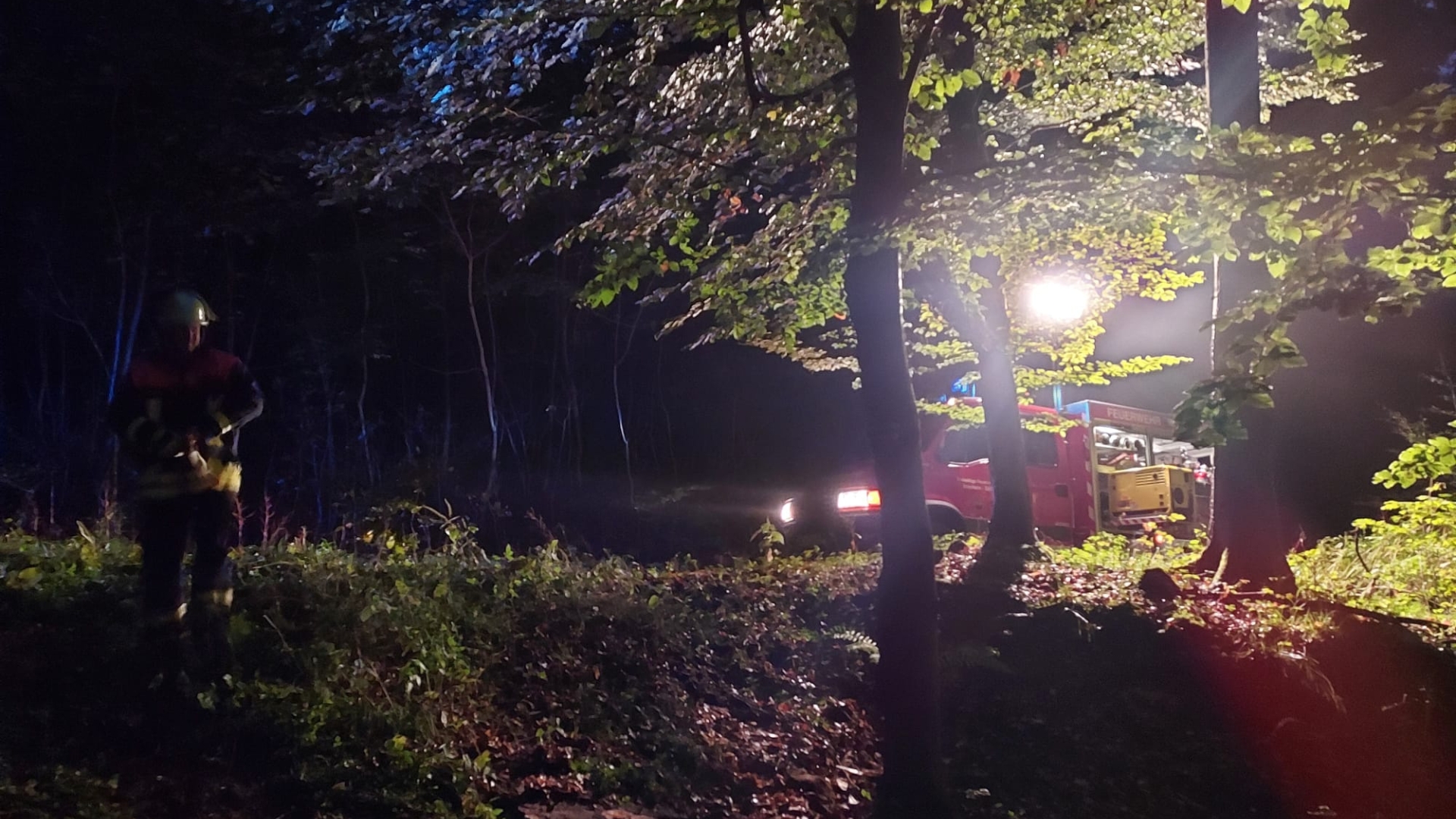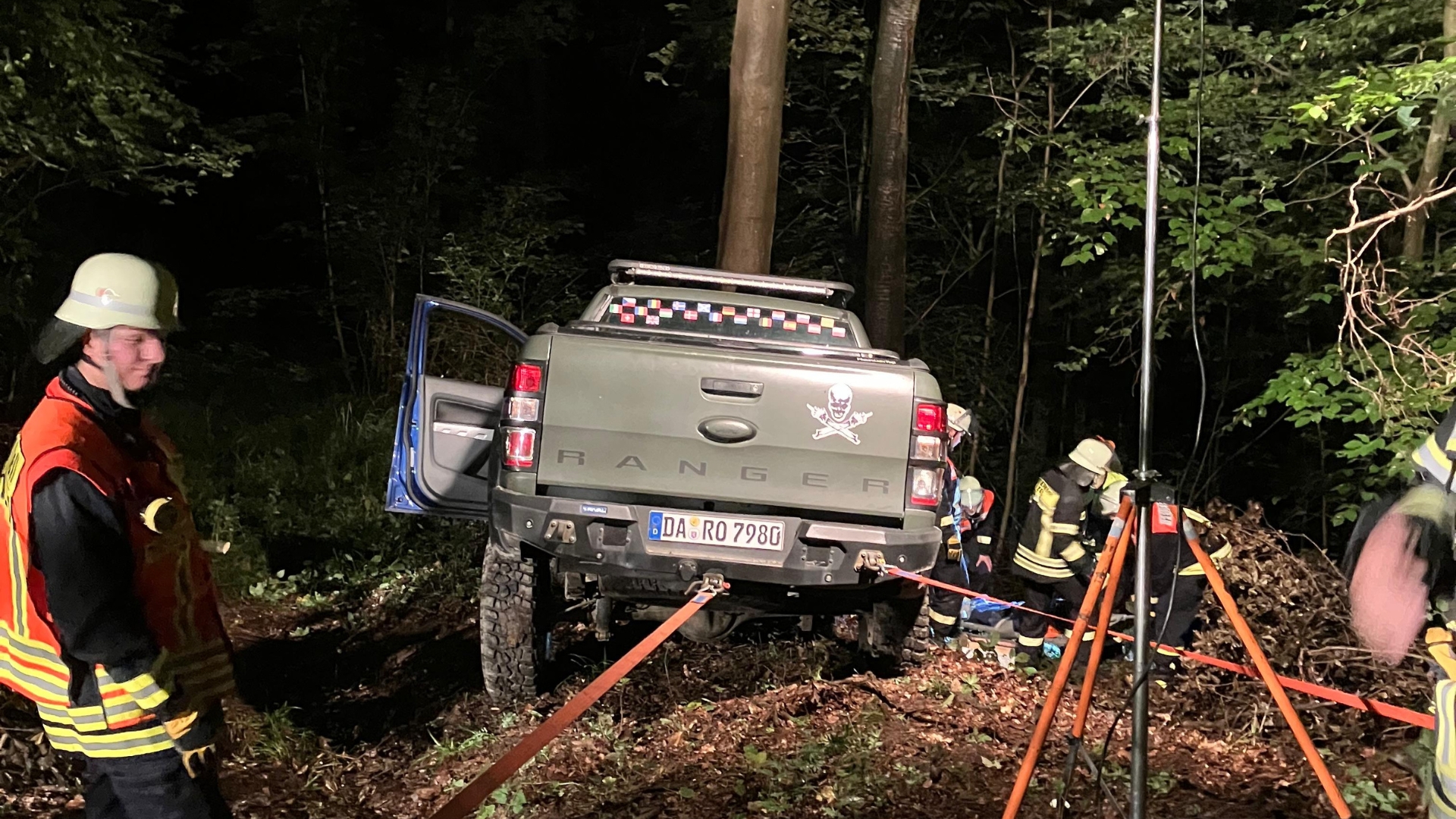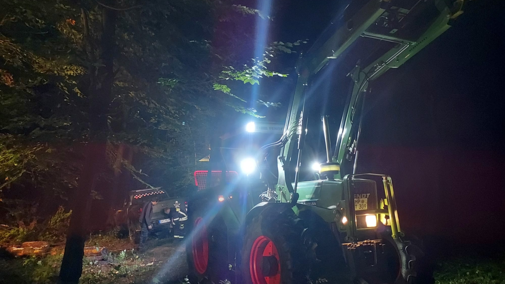 Vor Ort angekommen zeigte sich eine recht unübersichtliche Lage. Ein Forstunfall, eine eingeklemmte Person unter einem Baumstamm, ein vom Waldweg abgekommenes Fahrzeug mit samt verletztem Fahrer und noch eine weitere Person, die von diesem Fahrzeug angefahren wurde.